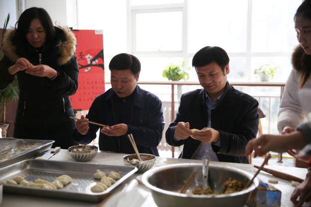中午时分,思邈堂里热闹非凡。同学们与学院领导围坐在桌子周围各显身手,揉面团、擀面皮,忙的不亦乐乎。动手之余,学院领导与贫困学生进行谈心,详细了解了贫困生的家庭经济情况、学习情况,并鼓励他们增强克服暂时困难的信心,以优异的成绩回报社会,回报每一个关心和帮助他们的人。同时,他们表示,在生活上有任何困难可以及时向学院反映,学院一定会尽最大努力从各个方面给予贫困学生更多地帮助。听完这一席话,同学们的心里暖暖的,也逐渐打开了话匣子。从“王书记,您最喜欢吃什么陷的饺子”,到“王院长,您的大学生活是如何度过的”,同学们与两位领导不断交流着,两位领导亲切认真的回答使现场氛围温馨和谐。