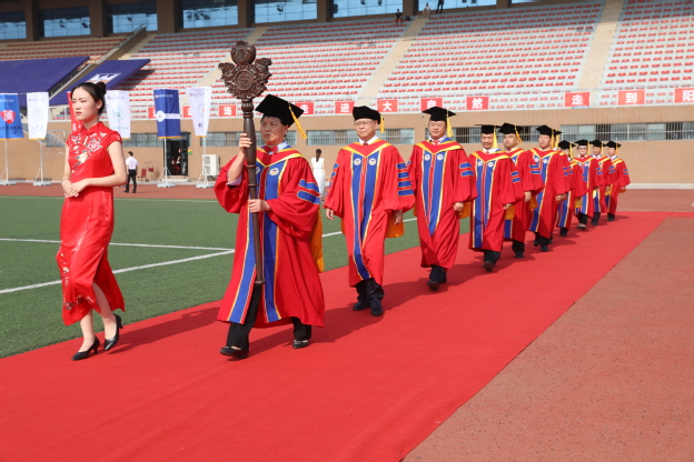 典礼现场,气氛庄严肃穆而又爱意无限。毕业生们依次踏过别致、走心的“毕业门”,在“三全时光列车”里追忆大学时光,在“请假条”前纷纷合影留念,成了典礼现场一道道亮丽的风景线。典礼开场前,在庄严的音乐声中,杜华贞教授和卢龙斗教授分别手持威严、崇高的权杖,引领两校区领导及学位委员会成员健步入场,展现了学术至上、人文至上的心灵呼唤与三全人勇于创新、追求卓越的精神风貌。随后,进行了庄严的升国旗仪式。