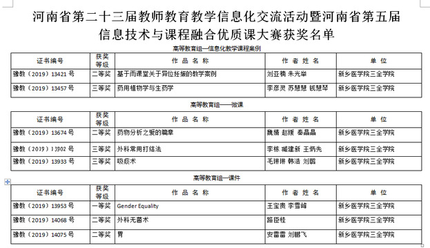 临床学院刘亚楠的《基于雨课堂关于异位妊娠的教学案例》荣获信息化教学课程案例组二等奖;药学院魏婧的《药物分析之爱的篇章》荣获微课组二等奖;临床学院路臣桂的《外科无菌术》、基础医学院安雷雷的《胃》2件作品分别荣获课件组二等奖。