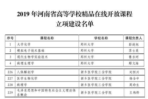 河南省高等学校精品在线开放课程竞争类项目重在突出共建共享,鼓励不同院校以课程联盟、专业联盟、教学指导委员会等方式,集中优势资源,联合打造精品大课和系列课程,跨校共选共用。我校根据《河南省教育厅关于遴选省级精品在线开放课程的通知》文件精神,积极组织专人申报,经院系推荐,学校遴选,省级评审、评审公示,最终刘恒兴教授主讲的《人体解剖学》,杨全中老师主讲的《医学生物化学》,周玲生教授主讲的《病理学》,王炜烨副教授主讲的《毛泽东思想和中国特色社会主义理论体系概论》四门课程获得省级立项。