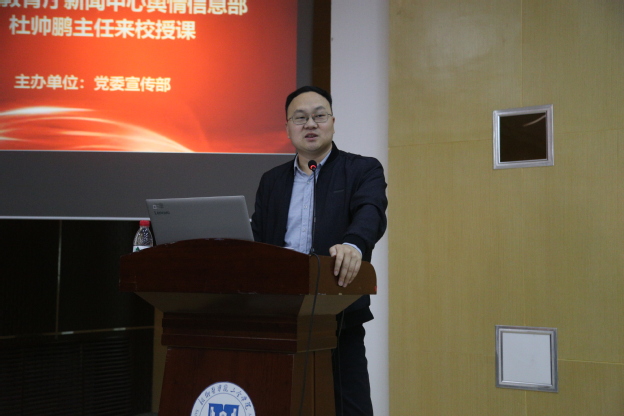 为进一步加强和我校新闻舆论工作,持续提升通讯员队伍业务水平,10月23日上午,河南省教育厅新闻中心舆情信息部主任杜帅鹏应邀来我校做“新形势下高校新闻宣传及信息写作相关知识”专题讲座。讲座在平原校区三楼学术报告厅举行,各党总支、职能部门、院(系、部)、书院新闻工作负责人、通讯员及学生记者100余人参加。