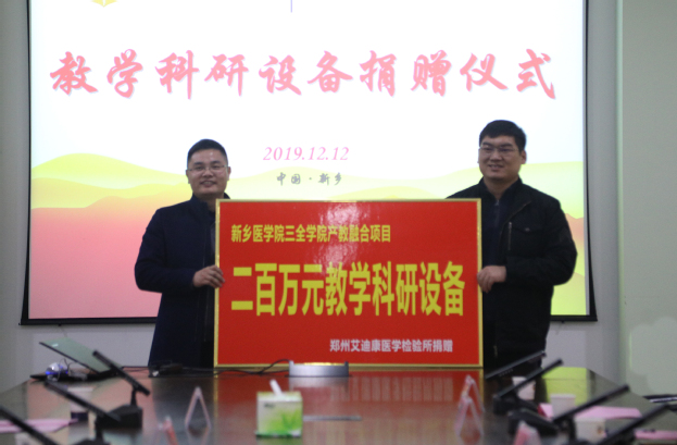 12月12日上午,郑州艾迪康医学检验所向我校医学检验学院捐赠教学科研设备仪式在行政楼第五会议室举行。艾迪康医学检验中心有限公司总经理章明在、病理实验室经理张湘、人力资源部主管禹凡,我校副院长邱永建出席,产教融合办公室、医学检验学院、科研部、资产管理部等相关部门负责人参加。仪式由产教融合办公室主任张东主持。