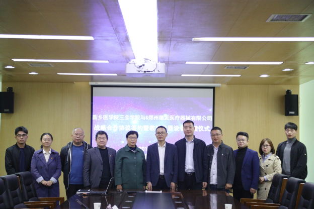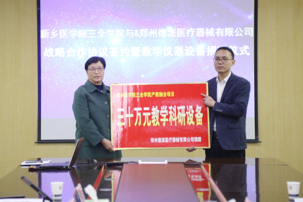 11月13日上午,我校与郑州德派医疗器械有限公司战略合作协议签约暨教学仪器设备捐赠仪式在平原校区行政楼第三会议室举行。郑州德派医疗器械有限公司总经理毛军伟、总经理助理陈聪、生产运营总监韩宝飞、人力资源部经理王平,我校教务长杜华贞出席,产教融合办公室、口腔技术学院、仁智书院等相关部门负责人参加。仪式由产教融合办公室主任张东主持。