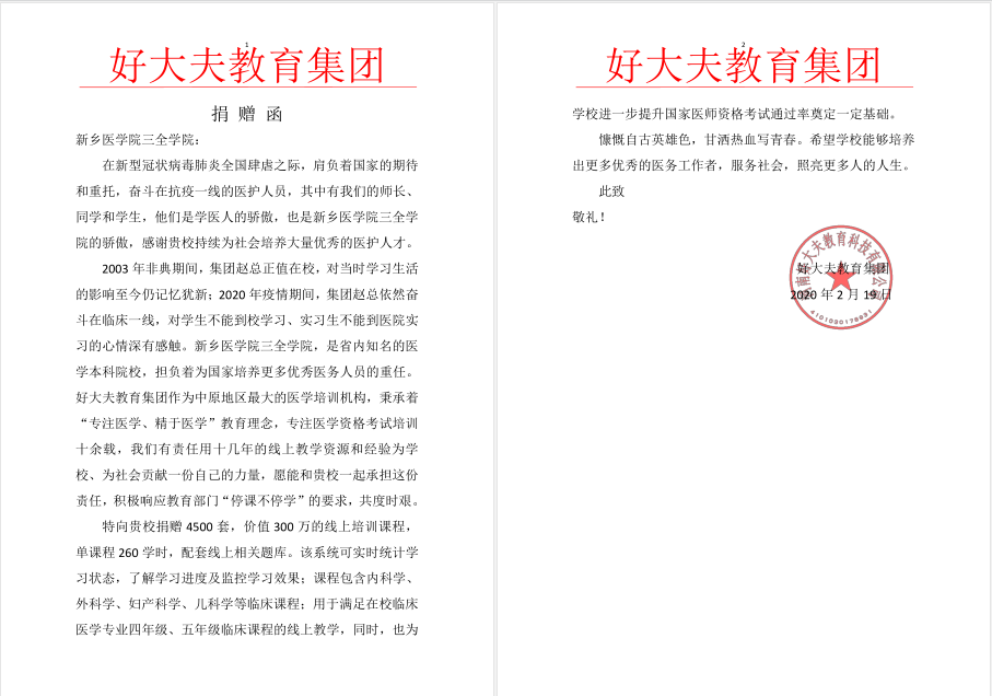 2月20日,我校收到好大夫教育集团捐赠函,该集团为支持学校疫情防控期间高质量开展网上教学,决定向我校捐赠研发的在线培训课程,首批捐赠4500套,价值300万元在线学习课程,包括《内科学》、《外科学》、《妇产科学》、《儿科学》等临床医学核心课程,协助学校针对疫情防控期间临床实习生组织网上教学。好大夫教育集团是中原地区最大的以教育培训、平台推广、合作加盟、人才输出、特色医疗“五位一体”、以“职业教育+互联网”为核心的多元化医学教育服务平台,此次捐赠义举为我校培养高素质医学人才奉献了力量。