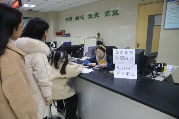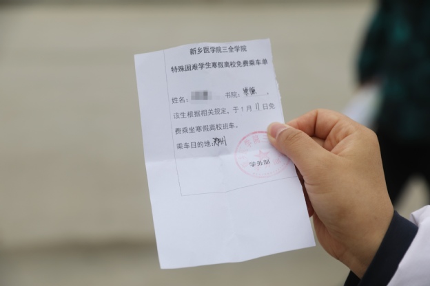 虽说是大学生返程高峰期,但三全学院大二学生小朱一点也不担心寒假回家这个问题。11日上午8时许,收拾好行李的她来到学务大厅2号窗口。学校老师在查验过她的一卡通后,就把一张免费乘车单递到了她的手中。有了这张乘车单,小朱坐车去新乡火车站是免费的。