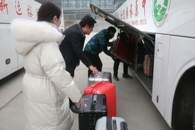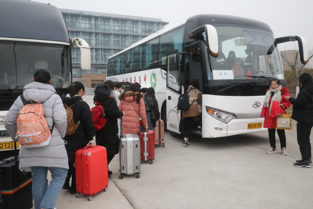 来到乘车点后,小朱发现有很多同学已经在车上了,让她意外的是,现场还有辅导员和学生志愿者帮忙搬行李。她说:“我们学校离新乡火车站和郑州新北站都比较远,学校这样的安排,真的很贴心。”