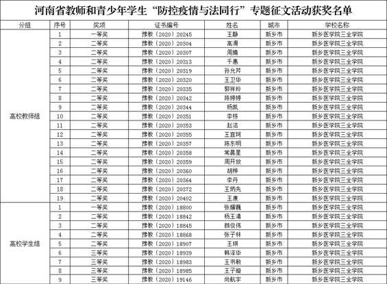 近日,河南省教育厅、河南省司法厅、河南省普法教育工作领导小组办公室联合下发了《关于公布河南省教师和青少年学生“防控疫情 与法同行”专题征文活动获奖名单的通知》(教政法〔2020〕308 号),我校师生表现突出,28人获奖。其中王静获高校教师组一等奖,高滑、周婧等18名教师获二等奖;张耀巍获高校学生组一等奖,杨玉清等8名同学分获二等奖和三等奖。