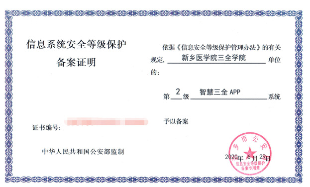为贯彻落实《中华人民共和国网络安全法》,不断提升学校网络信息系统安全保障能力和防护水平,按照教育部印发的《高等院校管理服务类教育移动互联网应用专项治理行动方案》和河南省教育厅印发的《关于开展教育移动互联网应用程序备案工作的通知》要求,我校智慧三全APP系统经过等级保护测评和备案,顺利取得公安部门颁发的信息系统安全等级保护备案证书。