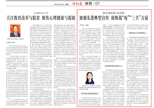 “她退了回河南的车票,选择留在武汉抗疫一线”“河南大学生郝莺歌:把实习成绩写在武汉抗疫一线”“全省唯一!新乡大学生跻身‘全国勤学上进好青年’”……疫情防控以来,新乡医学院三全学院师生抗疫的先进事迹被《人民日报》、中央广播电视总台、《河南日报》、河南卫视等数十家主流媒体报道,在社会上产生了广泛积极影响。