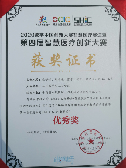 近日,由河南省卫生统计信息中心指导,河南省卫生信息学会远程医疗专委会、大河网主办,河南省远程医学中心等单位协办的第四届智慧医疗创新大赛(河南赛区)暨首届河南省数字健康医疗创新大赛在郑州举行,我校参赛项目《“互联网+分级诊疗+健康扶贫”在平舆县人民医院的实践研究》荣获大赛优秀奖。