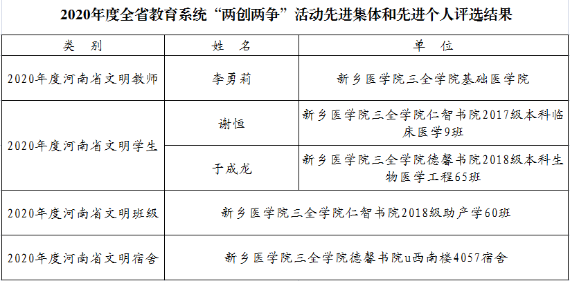 我校基础医学院李勇莉教授荣获“2020年度河南省文明教师”称号,谢恒、于成龙两位同学荣获“2020年度河南省文明学生”称号,仁智书院2018级助产学60班荣获“2020年度河南省文明班级”称号,德馨书院u西南楼4057宿舍荣获“2020年度河南省文明宿舍”称号。