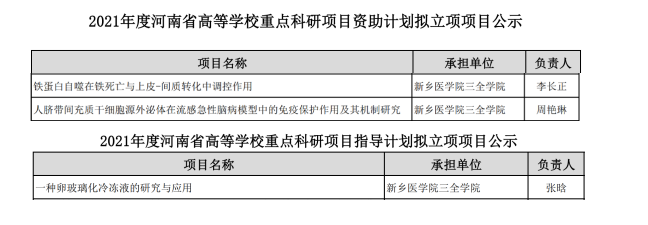 近日,河南省科技厅发布了《2021年度河南省高等学校重点科研项目计划拟立项项目公示》,我校李长正教授申报的《铁蛋白自噬在铁死亡与上皮-间质转化中调控作用》项目与周艳琳老师申报的《人脐带间充质干细胞源外泌体在流感急性脑病模型中的免疫保护作用及其机制研究》获批2021年度河南省高等学校重点项目资助计划,张晗老师申报的《一种卵玻璃化冷冻液的研究与应用》获批2021年度河南省高等学校重点项目指导计划。