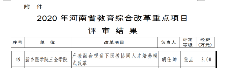 近日,河南省教育厅发布《关于做好2020年教育综合改革重点项目管理工作的通知》(教发规〔2020〕239号),我校胡仕坤教授申报的《产教融合视角下医教协同人才培养模式改革》项目获批河南省2020年教育综合改革重点项目,获批资助资金3万元。