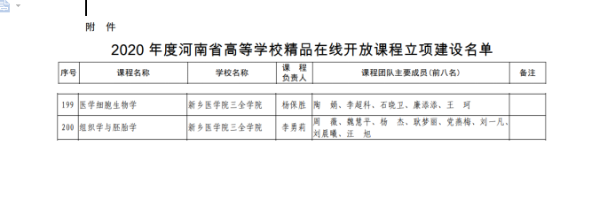 日前,河南省教育厅下发了《河南省教育厅关于公布2020年河南省高等学校精品在线开放课程立项建设名单的通知》教高〔2021〕4号,我院《医学细胞生物学》和《组织学与胚胎学》2门课程获得立项建设。