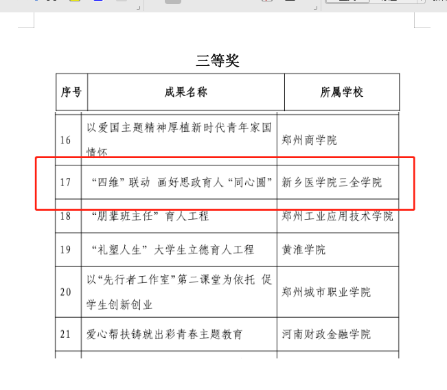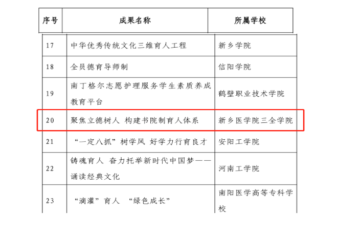 此次评选由河南省教育厅主办,并将择优选取部分获奖项目参加全省高校学生工作优秀成果展演活动。我校于今年7月组织开展项目申报,经省教育厅专家评审,学务部《聚焦立德树人 构建书院制育人体系》荣获二等奖,精诚书院《四维”联动 画好思政育人“同心圆”》荣获三等奖。