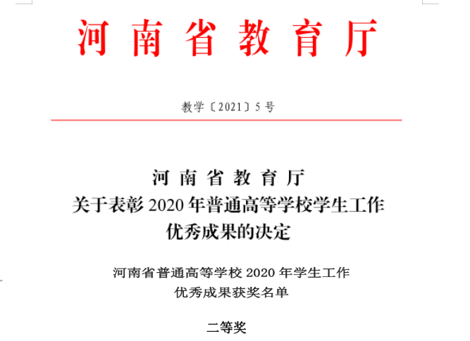 近日,河南省教育厅公布了《河南省教育厅关于表彰2020年普通高等学校学生工作优秀成果的决定》,我校共有2项成果获奖。